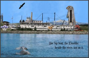 Part of what makes Walking in Whitehorse a counting adventure is that it is an introduction to some of those animals and plants, with clear, full colour pictures for identification (though the scale is not to be trusted – ground squirrels are not taller than boats!). All natural flora and fauna featured, including 28 (or so) species of Yukon wildflowers, are identified by name in full spreads on the end pages, as are ten mountains in the Whitehorse area. At this time I’m still working on figuring out some of the common English names, and those are what will be in the book, but I will have scientific names and other languages on this site as I learn them, and maybe there will even be translations! (Gotta think big, right?)