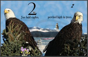 Walking in Whitehorse is also a counting adventure because of all the things there are to find. One big boat, two bald eagles, three wide mountains, four playing foxes… and one of everything else, two of everything else, three of everything else, right on up to ten each of boats, eagles, mountains, foxes, kinds of flowers, squirrels, swans, humans, ravens and dogs! Along with at least one white horse on every page. And maybe some extras I’ll be able to squeeze in…