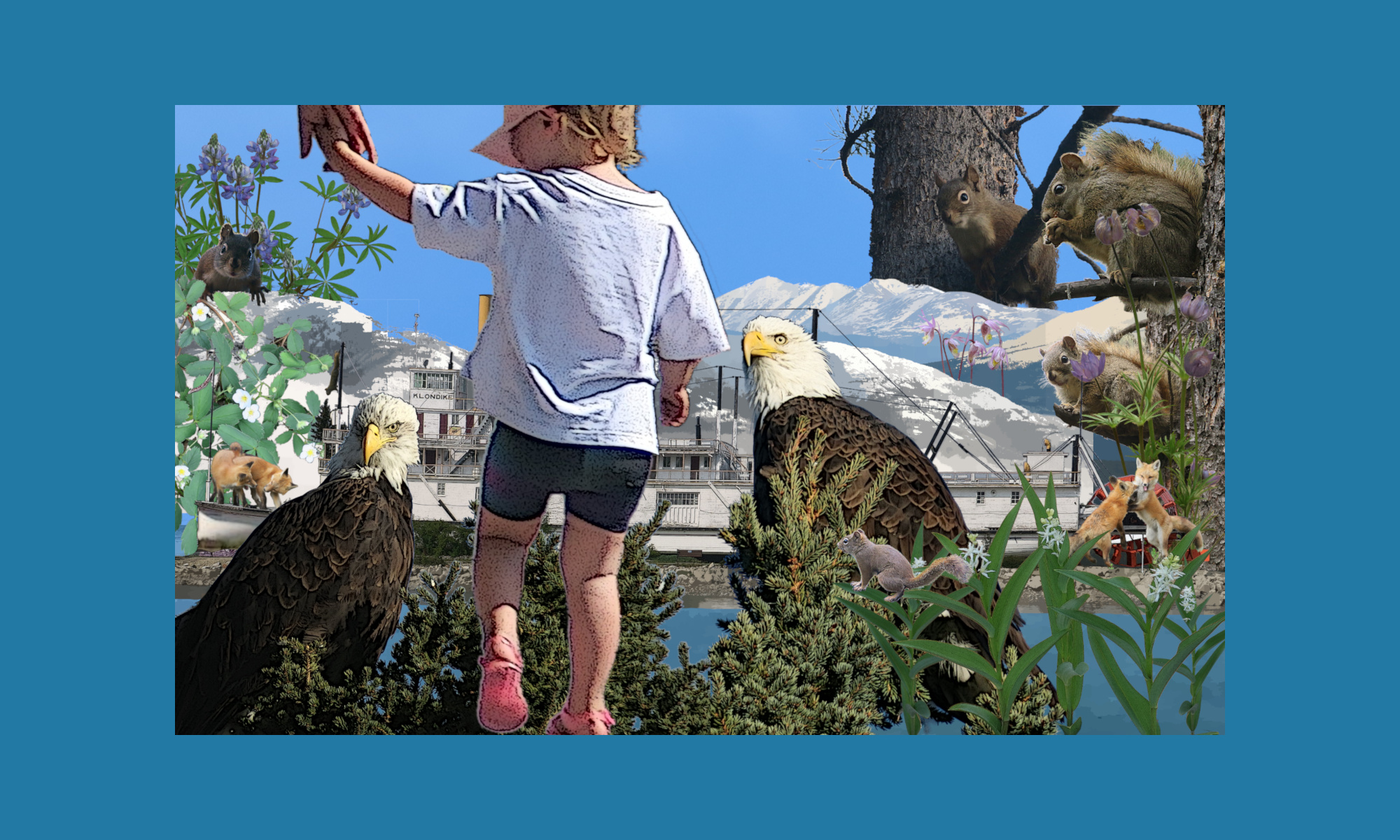 Walking in Whitehorse is a counting book for kids, that I hope adults will enjoy as well. It’s a busy book, with more to count on every page. Every page is covered with a beautiful, somewhat whimsical two-page spread in full colour. The pictures are digital photo collages, created by me, Peri Livesey, mostly from my own photos, taken on walks in the wilderness city of Whitehorse, in the Yukon, in Canada.